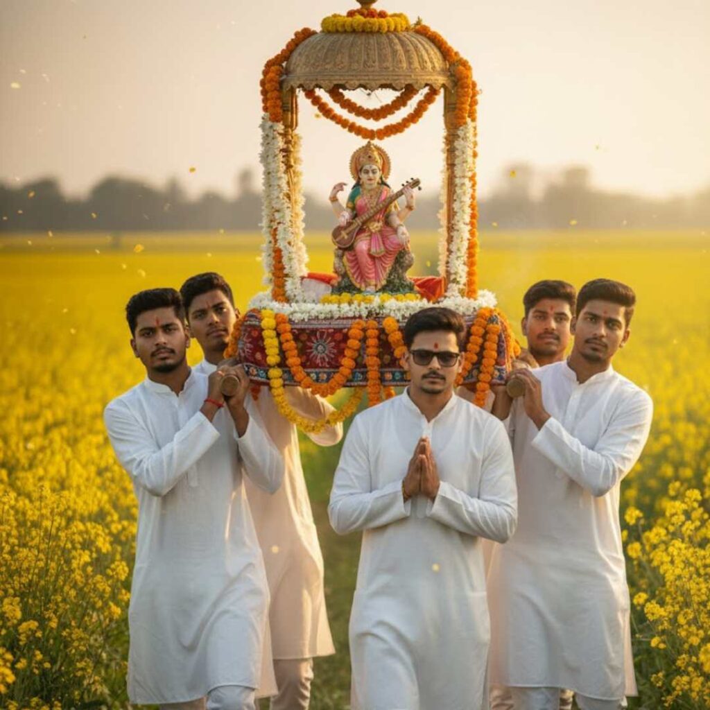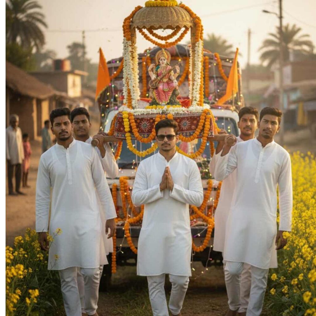 Prompt 3 – A realistic cinematic scene of a 25-year-old Indian boy respectfully carrying Maa Saraswati idol along with his team. The idol of Maa Saraswati is beautifully crafted, traditional white murti with veena, placed on a decorated pandal platform. The boy and his team are wearing simple traditional Indian clothes, walking together with devotion and pride. In the background, a vast golden mustard field (sarson ka khet) is clearly visible, glowing in soft sunlight. The atmosphere feels spiritual, cultural, and emotional. Ultra-realistic, high detail, cinematic lighting, depth of field, Indian festival vibe, devotional mood, 4K quality, natural colors, realistic faces, sharp focus.